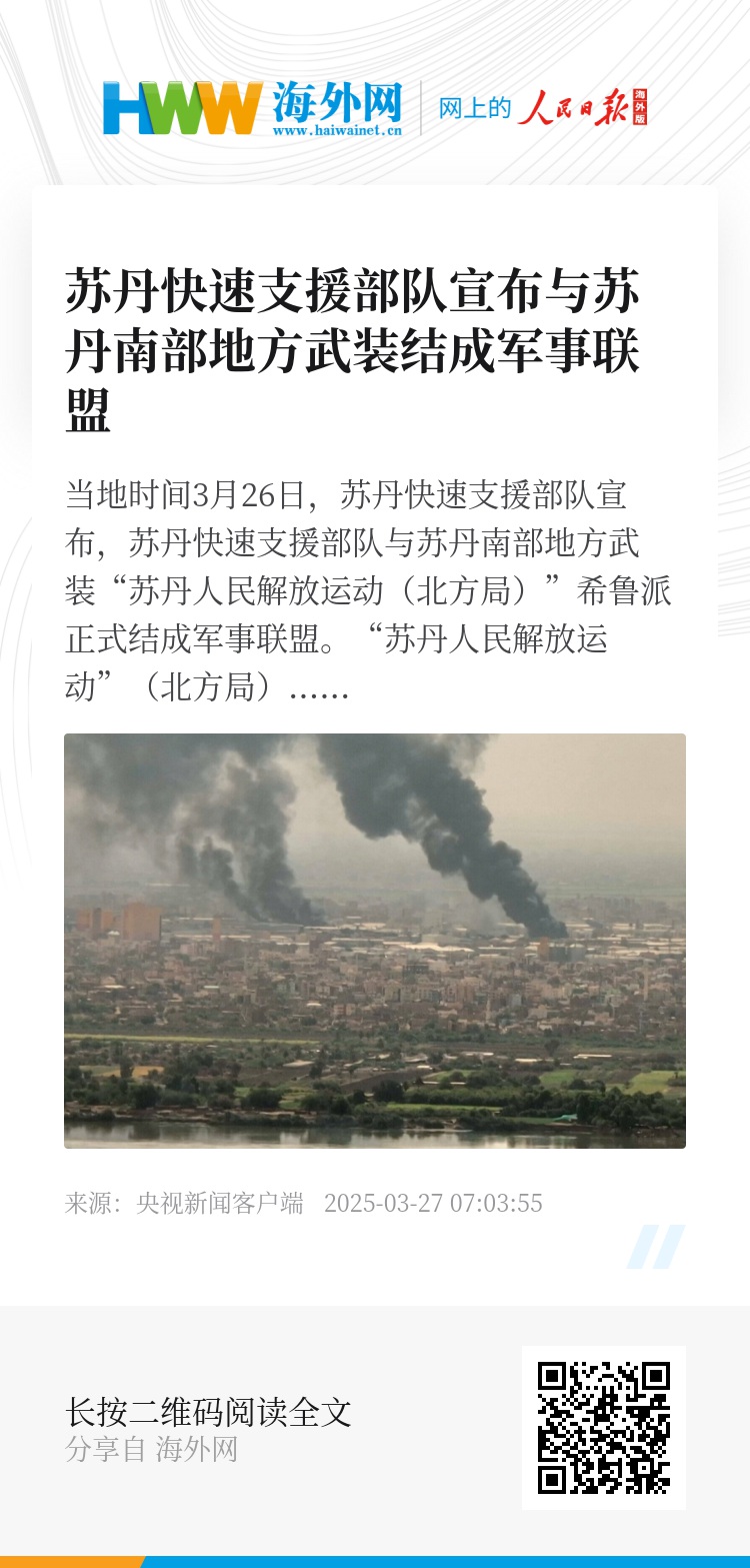 当地时间3月26日,苏丹快速支援部队宣布,苏丹快速支援部队与苏丹南部地方武装“苏丹人民解放运动(北方局)”希鲁派正式结成军事联盟。