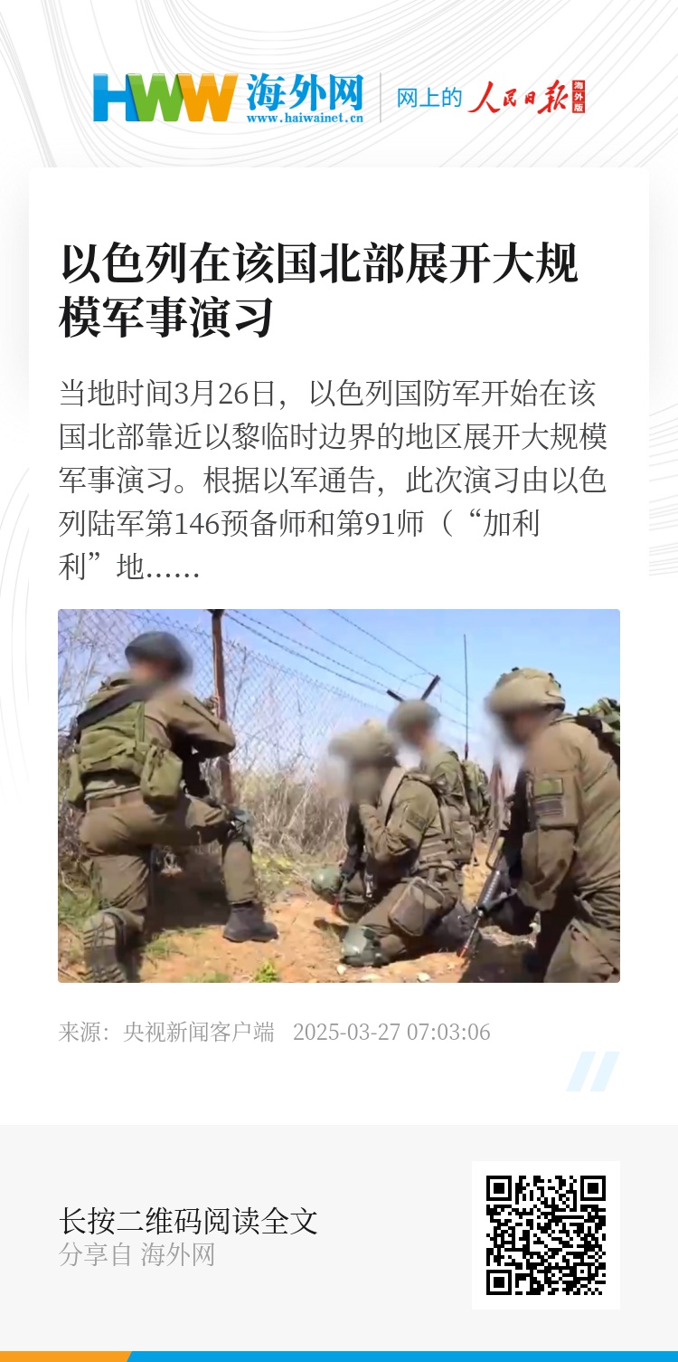 当地时间3月26日,以色列国防军开始在该国北部靠近以黎临时边界的地区展开大规模军事演习。