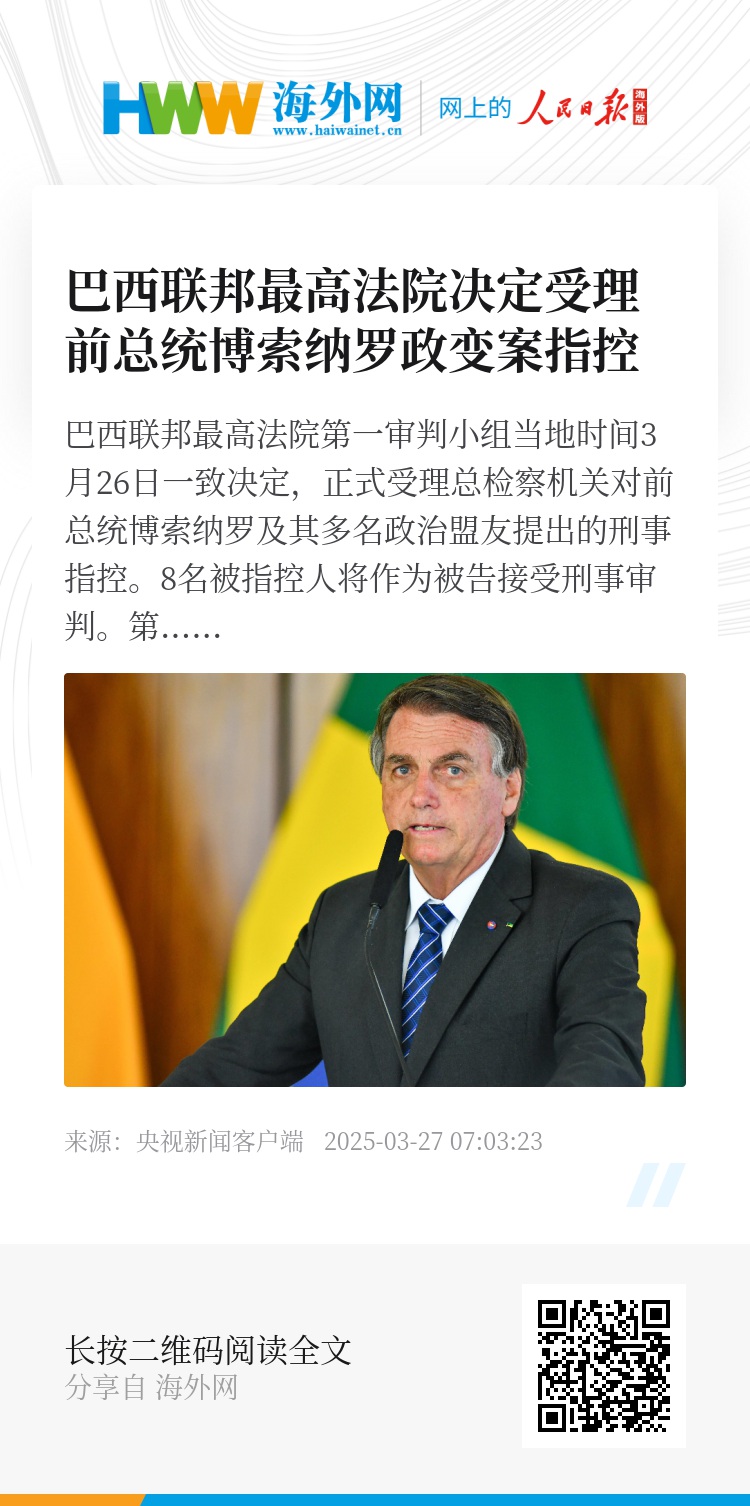 巴西联邦最高法院第一审判小组当地时间3月26日一致决定,正式受理总检察机关对前总统博索纳罗及其多名政治盟友提出的刑事指控。8名被指控人将作为被告接受刑事审判。