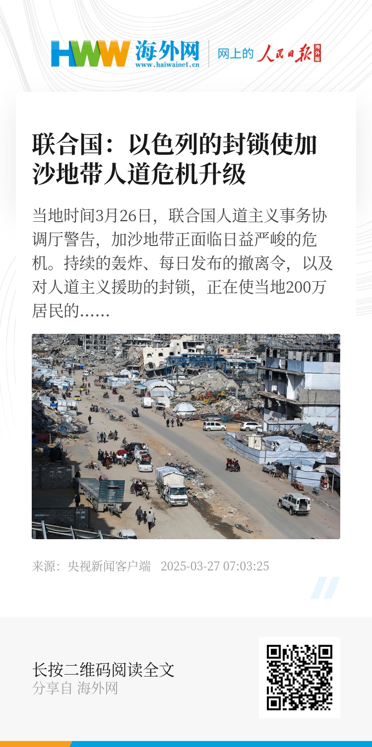 当地时间3月26日,联合国人道主义事务协调厅警告,加沙地带正面临日益严峻的危机。持续的轰炸、每日发布的撤离令,以及对人道主义援助的封锁,正在使当地200万居民的生存空间进一步缩小。