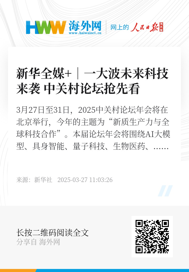 3月27日至31日,2025中关村论坛年会将在北京举行,今年的主题为“新质生产力与全球科技合作”。