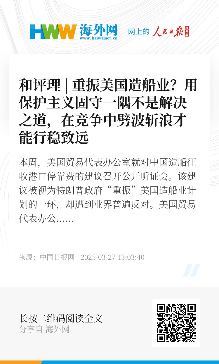 中国造船的竞争力,不是源自补贴,而是源自其经济规模、创新及高效的供应链。中国造船企业之所以能够领跑全球,是因为有能力生产出高品质、高性价比且符合国际需求的产品。美国要做的,不是把中国当成替罪羊,而是集中力量通过研发和劳动力培训打造现代化造船业;不是用加征关税扰乱供应链,而是强化供应链;不是诉诸贸易保护主义行径,而是推动公平竞争。