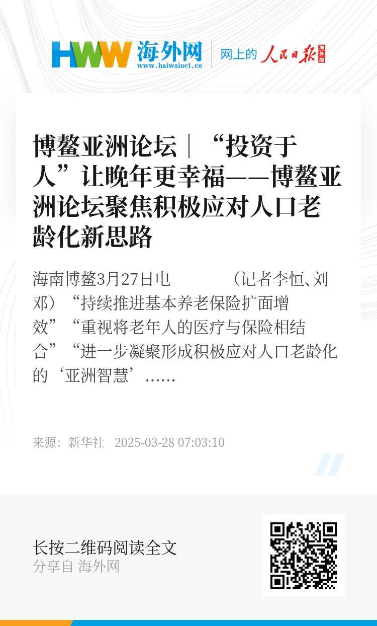新华社海南博鳌3月27日电 (记者李恒、刘邓)“持续推进基本养老保险扩面增效”“重视将老年人的医疗与保险相结合”“进一步凝聚形成积极应对人口老龄化的‘亚洲智慧’,助力建设亚洲命运共同体”……正在举办的博鳌亚洲论坛2025年年会上,积极应对人口老龄化引起广泛关注。