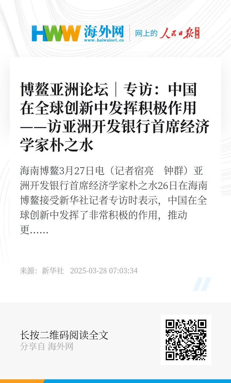 新华社海南博鳌3月27日电(记者宿亮 钟群)亚洲开发银行首席经济学家朴之水26日在海南博鳌接受新华社记者专访时表示,中国在全球创新中发挥了非常积极的作用,推动更多亚洲地区国家更快利用新技术、新能源,有效降低发展成本,支持经济快速增长。