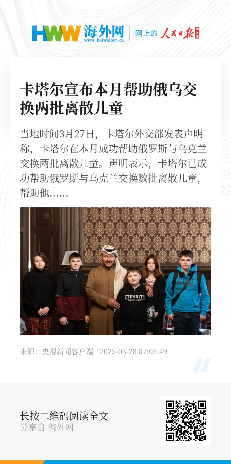 当地时间3月27日,卡塔尔外交部发表声明称,卡塔尔在本月成功帮助俄罗斯与乌克兰交换两批离散儿童。