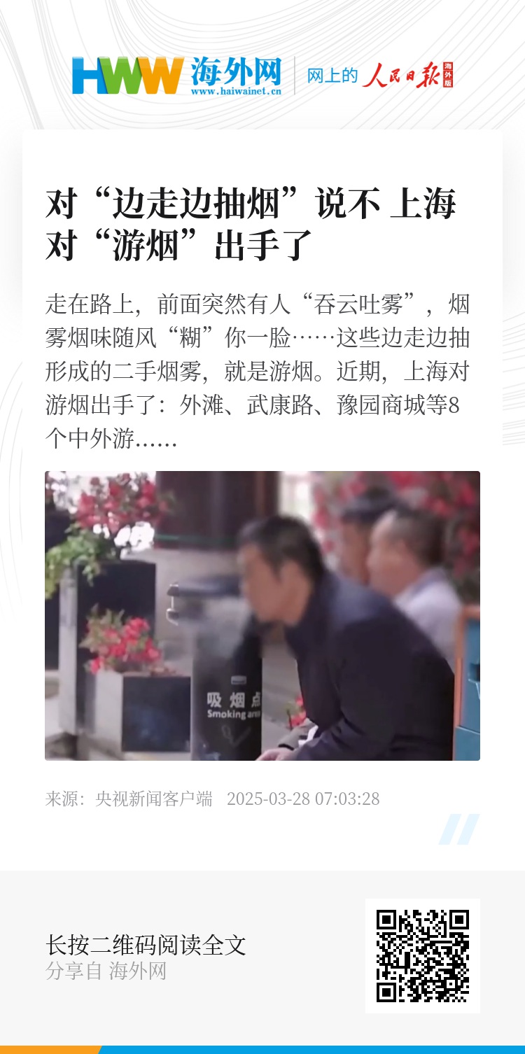 近期,上海对游烟出手了:外滩、武康路、豫园商城等8个中外游客集中、人群密集的“网红”地标场所,多举措重点推进“游烟”治理。商户室内摆放“禁止吸烟”提示牌;街边志愿者劝阻吸烟行为;绘制吸烟地图,方便吸烟者寻找吸烟点……既不罚款,也不强怼,主打一个“劝你善良”↑↑治理“游烟”的本质是文明与法治的共进,上海“疏堵结合”的治理智慧值得推广!