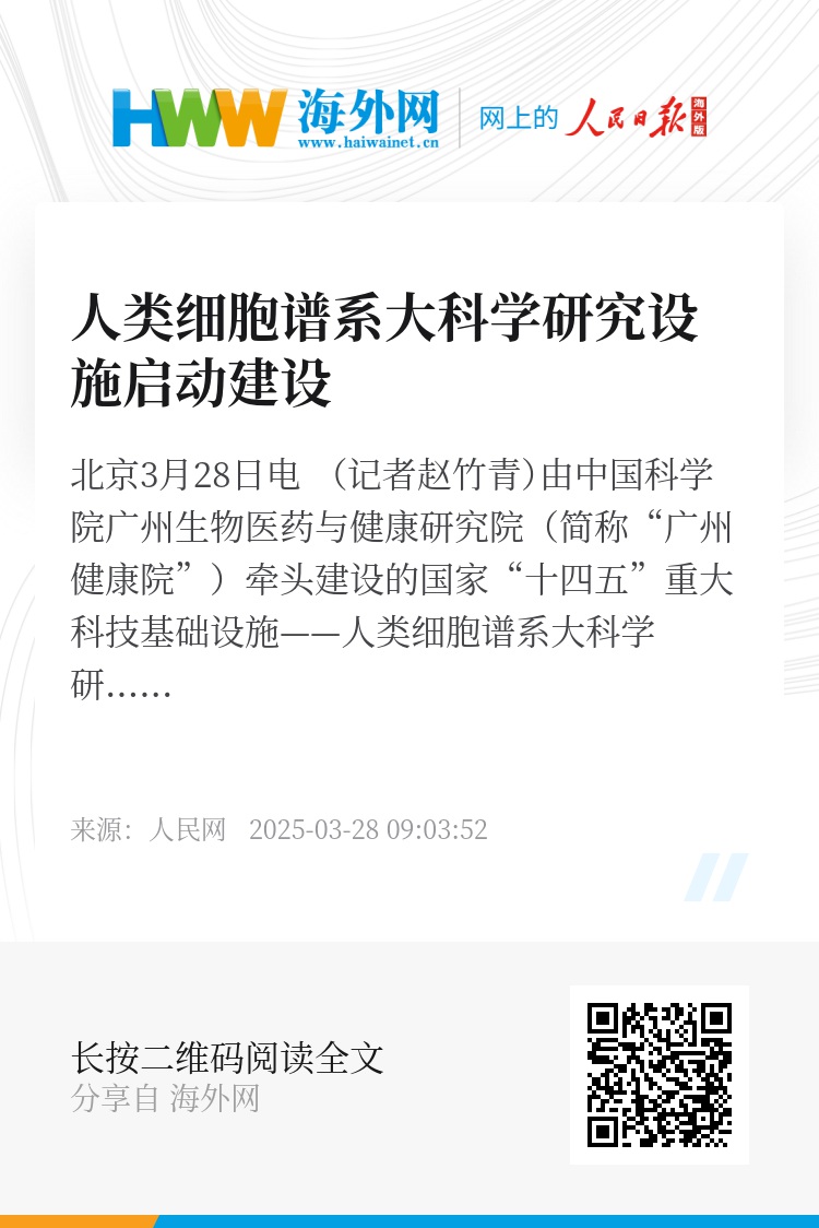 人民网北京3月28日电 (记者赵竹青)由中国科学院广州生物医药与健康研究院(简称“广州健康院”)牵头建设的国家“十四五”重大科技基础设施——人类细胞谱系大科学研究设施(简称“细胞谱系设施”)3月25日在广州国际生物岛正式启动建设。