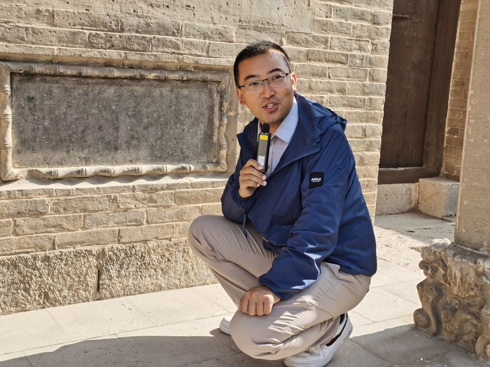 从“古建粉”到从业者,“80后”杨杰用自己的创业经历,展现出传统文化在新时代的实践可能。他创立的晋行记研学中心,聘请专业人士深入讲解,为喜爱古建的游客提供“沉浸式”研学体验。这是2023年5月20日,杨杰带领游客在山西长治参观淳化寺古迹。