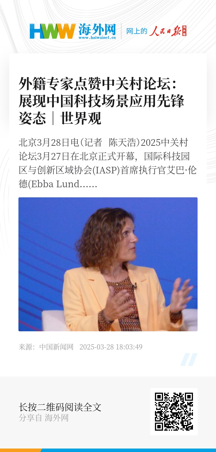 中新网北京3月28日电(记者 陈天浩)2025中关村论坛3月27日在北京正式开幕,国际科技园区与创新区域协会(IASP)首席执行官艾巴·伦德(Ebba Lund)在接受采访时高度评价北京科技创新生态的蓬勃发展,并强调中关村论坛作为全球科创交流枢纽的重要作用。