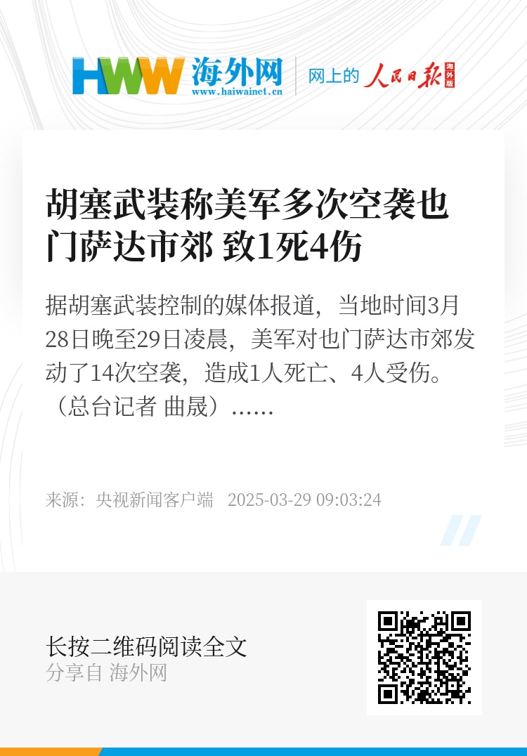 据胡塞武装控制的媒体报道,当地时间3月28日晚至29日凌晨,美军对也门萨达市郊发动了14次空袭,造成1人死亡、4人受伤。(总台记者 曲晟)