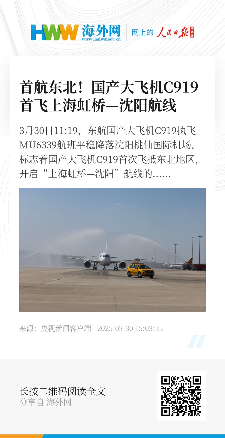 3月30日11:19,东航国产大飞机C919执飞MU6339航班平稳降落沈阳桃仙国际机场,标志着国产大飞机C919首次飞抵东北地区,开启“上海虹桥—沈阳”航线的商业运营。