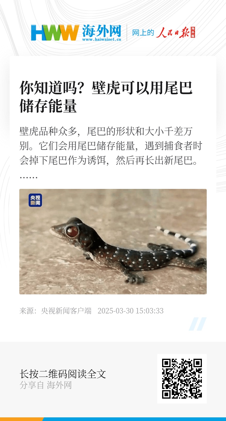 壁虎品种众多,尾巴的形状和大小千差万别。它们会用尾巴储存能量,遇到捕食者时会掉下尾巴作为诱饵,然后再长出新尾巴。