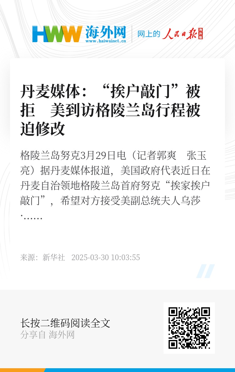 新华社格陵兰岛努克3月29日电(记者郭爽 张玉亮)据丹麦媒体报道,美国政府代表近日在丹麦自治领地格陵兰岛首府努克“挨家挨户敲门”,希望对方接受美副总统夫人乌莎·万斯拜访,但均遭到拒绝,这是导致美被迫修改到访格陵兰岛行程的原因之一。