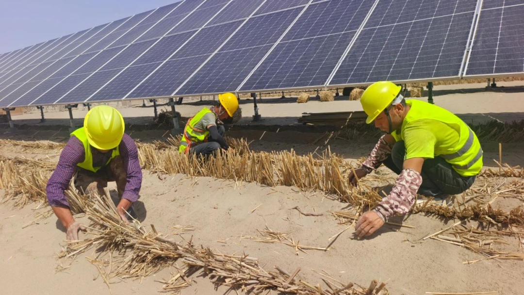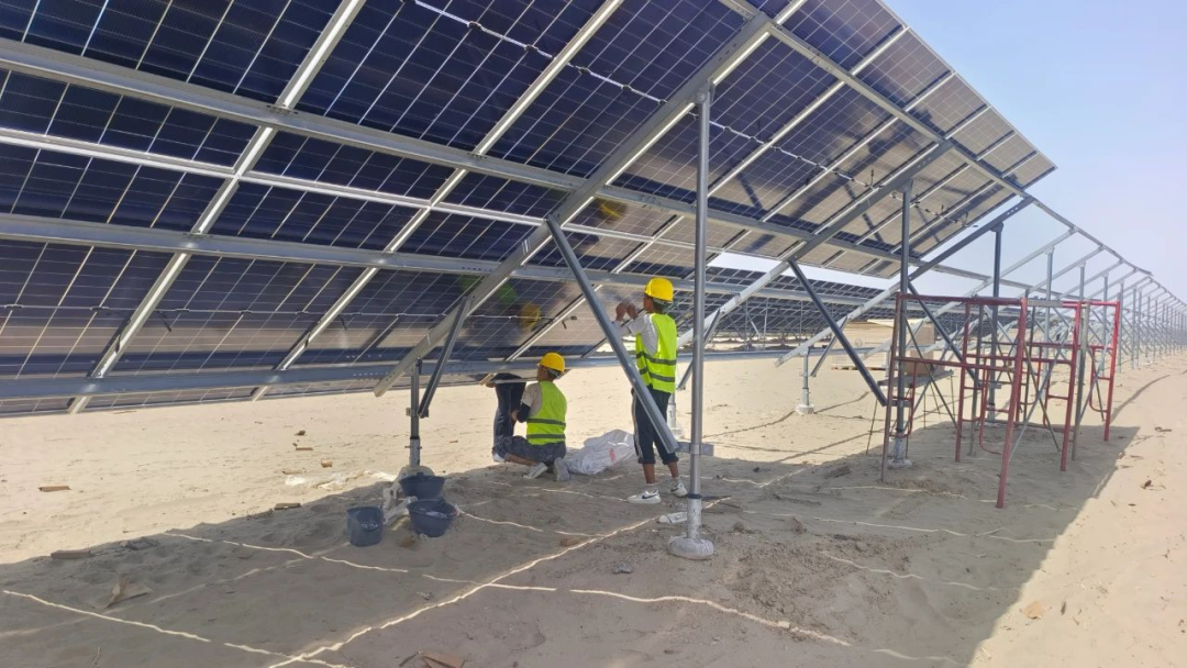 3月28日,在中国电建集团新疆分公司新能源公司沙雅县25万千瓦光伏项目施工现场,工人们正紧张地安装光伏板,周围草方格的铺设及梭梭的栽种也在同步开展当中。该项目施工负责人郝泽权说,光伏发电助力机电井抽取沙漠地表百米以下的微咸水灌溉梭梭林,解决了长期以来沙漠植绿缺水难题,实现生态与经济的双重收益。