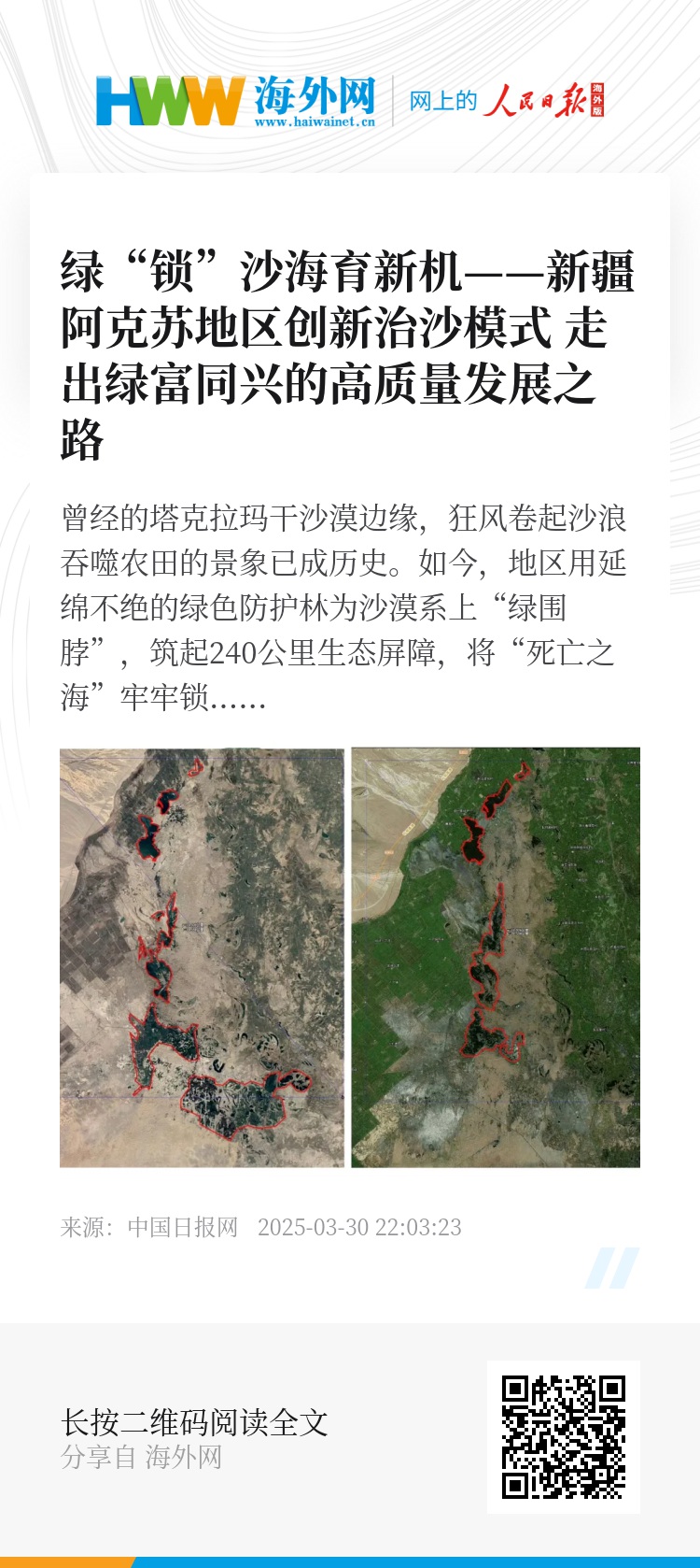 造林缚沙龙,逐绿向前行。塔克拉玛干沙漠边缘阻击战启动以来,阿克苏地区年年掀起集中会战、规模治沙热潮,重点实施“三北”防护林建设、退耕还林还草等生态建设重点工程。如今,在塔克拉玛干沙漠边缘,随着阻击战的深入推进,地区已成功在塔克拉玛干沙漠边缘筑起一道宽60公里、长386公里的绿色阻沙防护带,从高空俯视,犹如给塔克拉玛干沙漠周边织出一条绿色“围脖”,成功锁住了黄沙,有效控制了沙漠移动。