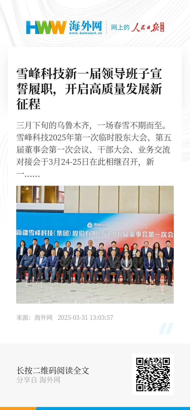 三月下旬的乌鲁木齐,一场春雪不期而至。雪峰科技2025年第一次临时股东大会、第五届董事会第一次会议、干部大会、业务交流对接会于3月24-25日在此相继召开,新一届党委班子、董事会、监事会及高管团队正式亮相,宣誓就职,标志着雪峰科技站上新起点、迈向高质量发展新征程。