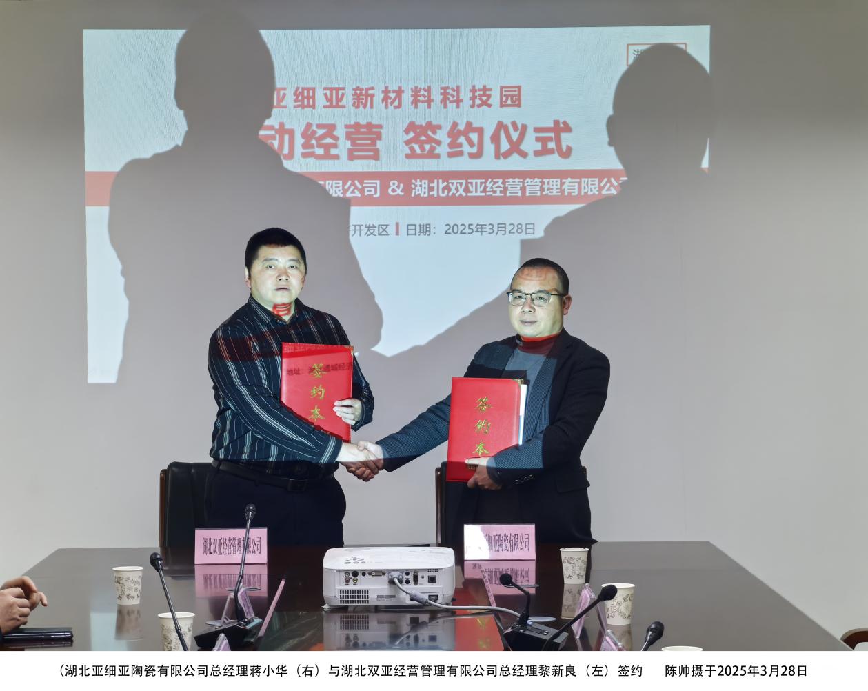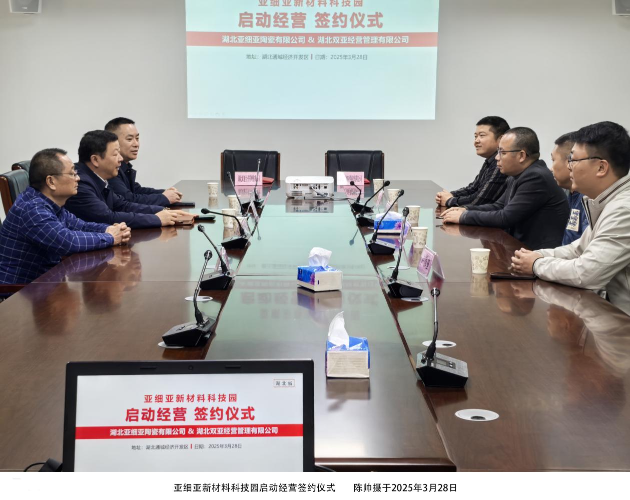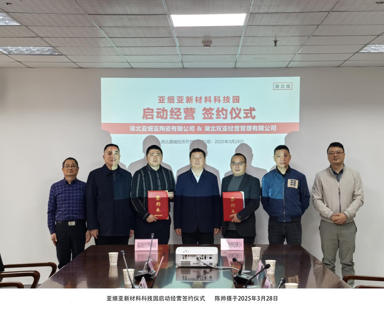 3月28日,亚细亚新材料科技园启动经营签约仪式在湖北通城经济开发区举行。在通城县经济开发区管委会主任夏效禹见证下,湖北亚细亚陶瓷有限公司总经理蒋小华与湖北双亚经营管理有限公司总经理黎新良签署合作协议,标志着这一重点项目进入实质性阶段。