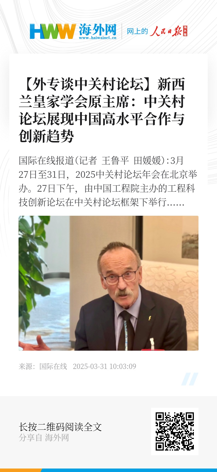 新西兰皇家学会原主席布伦特・尤安・克洛西尔(Brent Euan Clothier)在接受国际在线记者专访时表示,中关村论坛展现中国高水平合作与创新趋势。