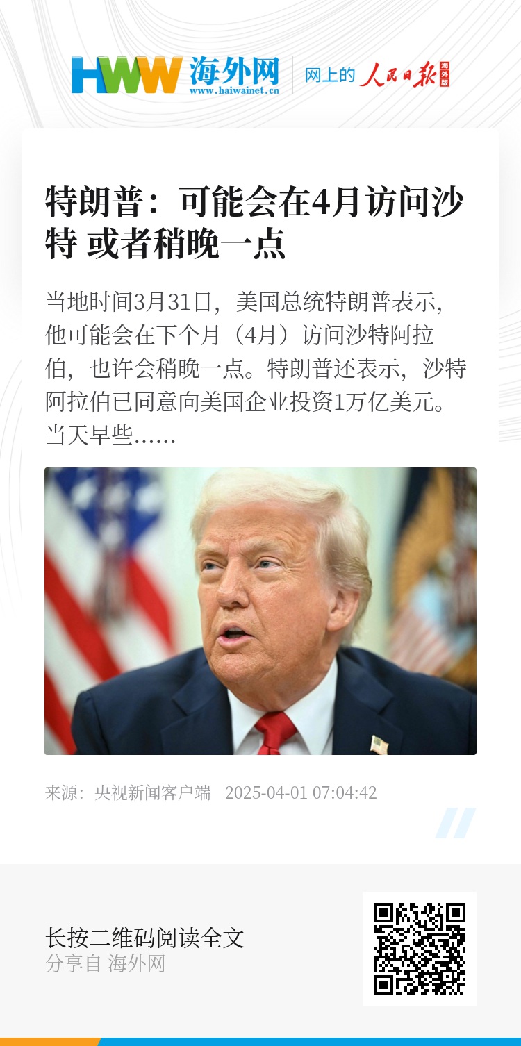 当地时间3月31日,美国总统特朗普表示,他可能会在下个月(4月)访问沙特阿拉伯,也许会稍晚一点。