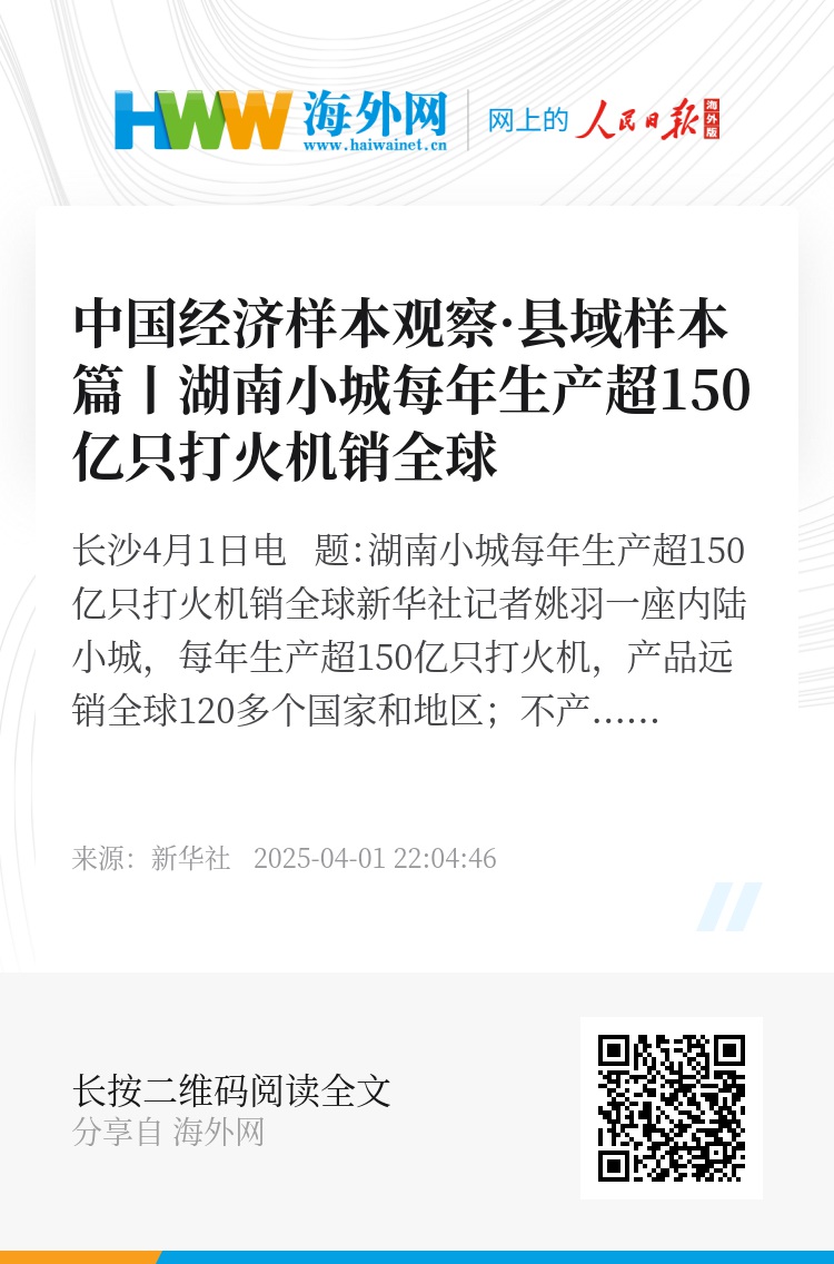 新华社长沙4月1日电 题:湖南小城每年生产超150亿只打火机销全球