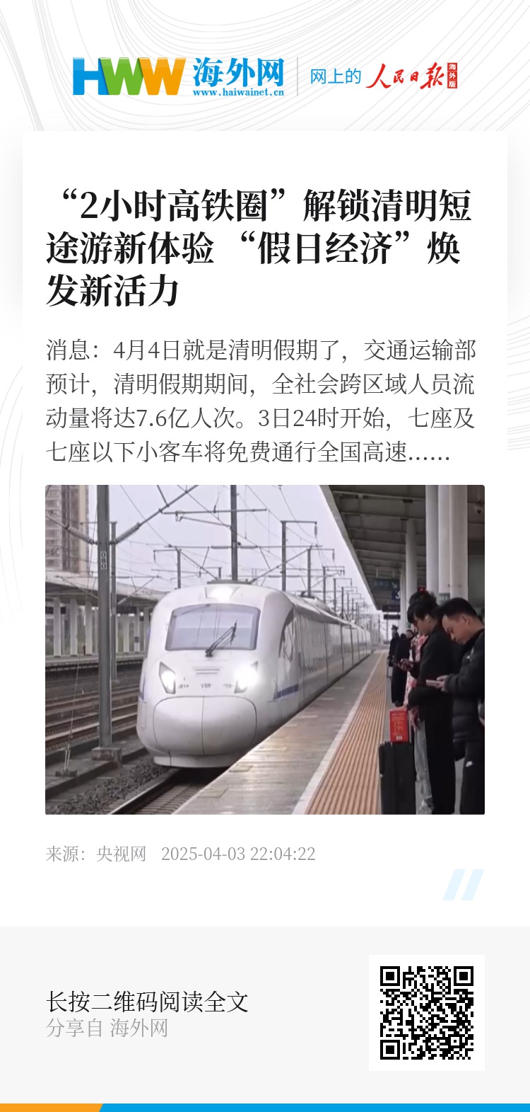 清明假期期间,旅客探亲祭祖、踏青旅游等出行需求旺盛。全国铁路预计发送旅客8450万人次,日均发送旅客1690万人次,4月4日为客流最高峰日。