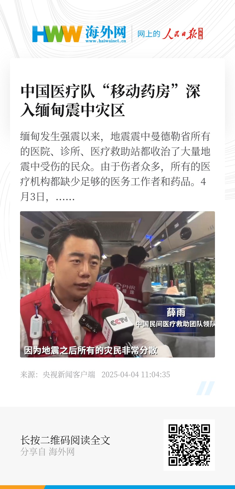 总台记者 刘畅:我现在是在缅甸地震震中的一处医疗救助站,一些在地震中受伤的民众被送到这里进行救治,但是整个医疗救助站都处于缺医少药的状态。今天,来自中国的骨科专家和医疗团队来到这里,为这些受伤的民众进行诊治,并送上他们急需的医疗物资。