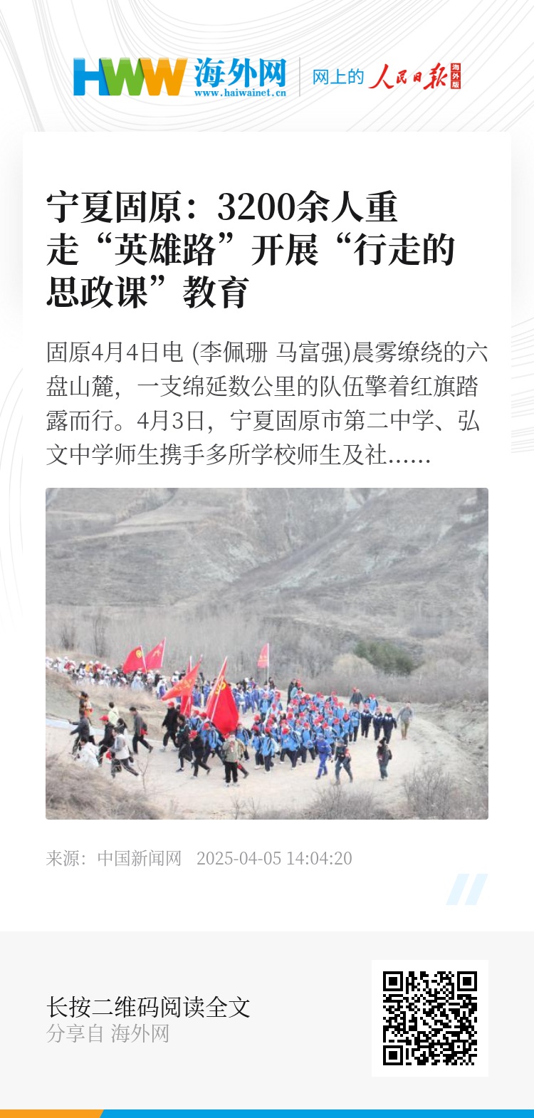 中新网固原4月4日电 (李佩珊 马富强)晨雾缭绕的六盘山麓,一支绵延数公里的队伍擎着红旗踏露而行。4月3日,宁夏固原市第二中学、弘文中学师生携手多所学校师生及社会人士共3200余人,沿108里崎岖山路徒步往返任山河烈士陵园,以特殊方式开展清明祭扫。这项始于1995年的“行走的思政课”,在黄土地上传续三十载,已成为全国思政教育的鲜活范本。