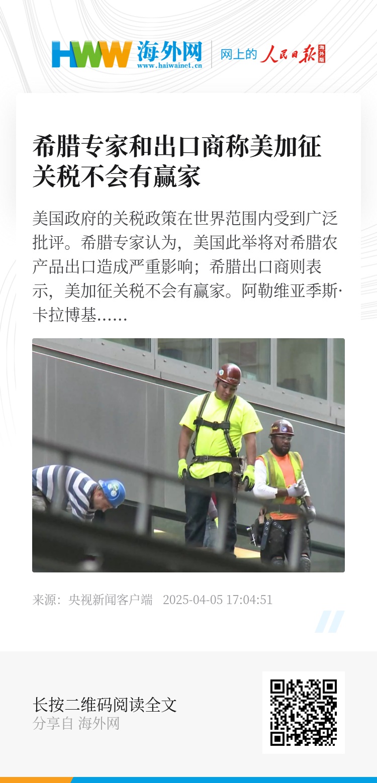 美国政府的关税政策在世界范围内受到广泛批评。希腊专家认为,美国此举将对希腊农产品出口造成严重影响;希腊出口商则表示,美加征关税不会有赢家。