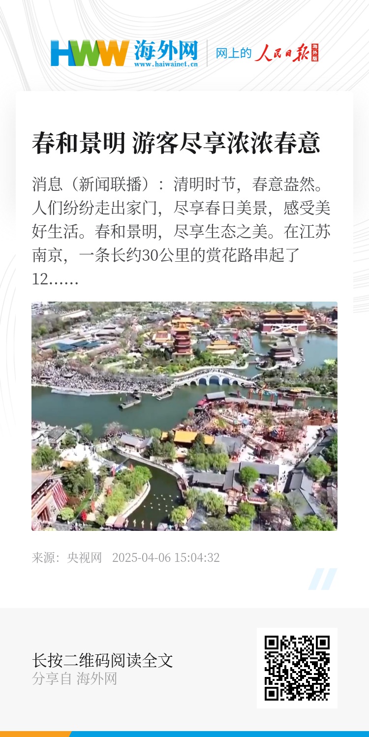 央视网消息(新闻联播):清明时节,春意盎然。人们纷纷走出家门,尽享春日美景,感受美好生活。