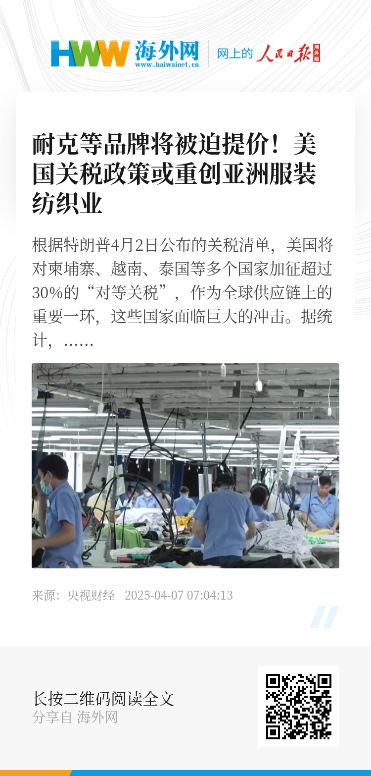 越南纺织服装协会的数据显示,2024年越南纺织品服装出口额达440亿美元,美国是其最大市场,耐克、露露乐蒙等服装品牌超过35%的产能聚集在越南。随着美国所谓“对等关税”措施即将实施,这些服装品牌将被迫提价。