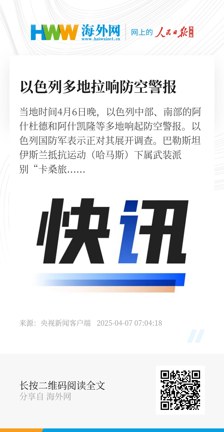当地时间4月6日晚,以色列中部、南部的阿什杜德和阿什凯隆等多地响起防空警报。以色列国防军表示正对其展开调查。