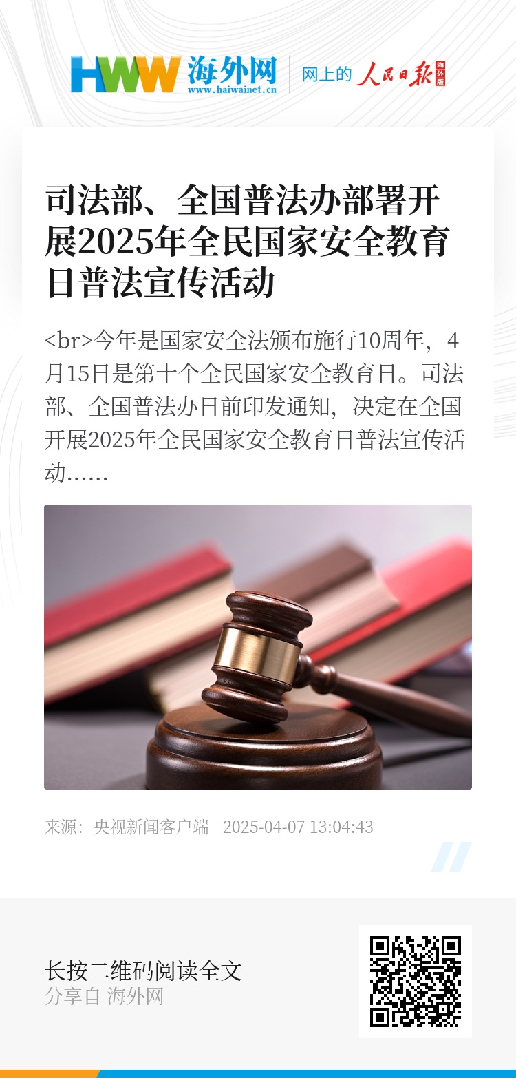 今年是国家安全法颁布施行10周年,4月15日是第十个全民国家安全教育日。司法部、全国普法办日前印发通知,决定在全国开展2025年全民国家安全教育日普法宣传活动。