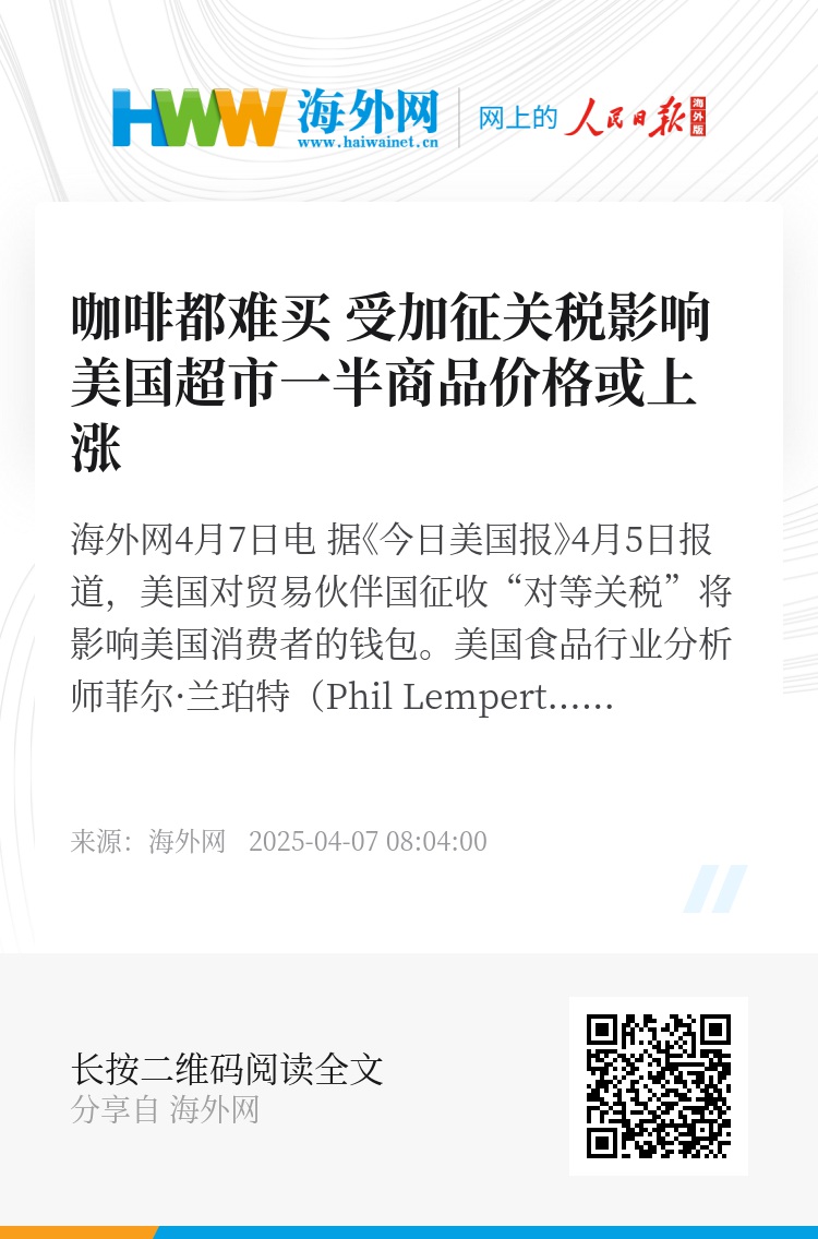 “咖啡都难买”,报道说,美国是世界上最大的咖啡进口国。美国农业部表示,全美约80%的烘焙咖啡来自拉丁美洲。巴西和哥伦比亚都被征收了10%的“对等关税”。此外,进口酒类产品市场也将遭受重创,橄榄油的价格也会飙升。(海外网 李萌)