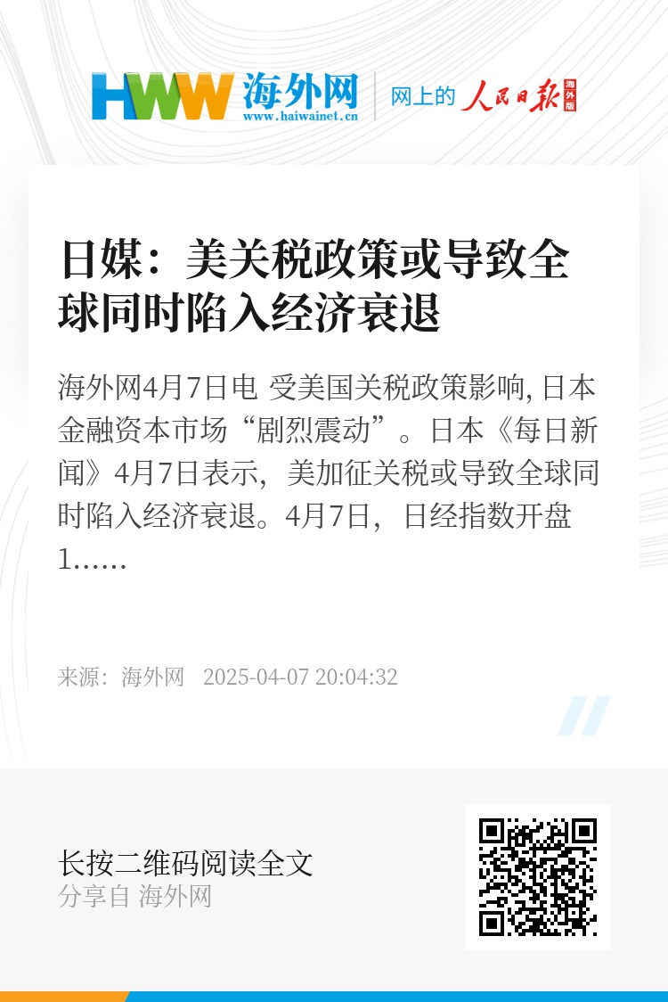 海外网4月7日电 受美国关税政策影响,日本金融资本市场“剧烈震动”。日本《每日新闻》4月7日表示,美加征关税或导致全球同时陷入经济衰退。