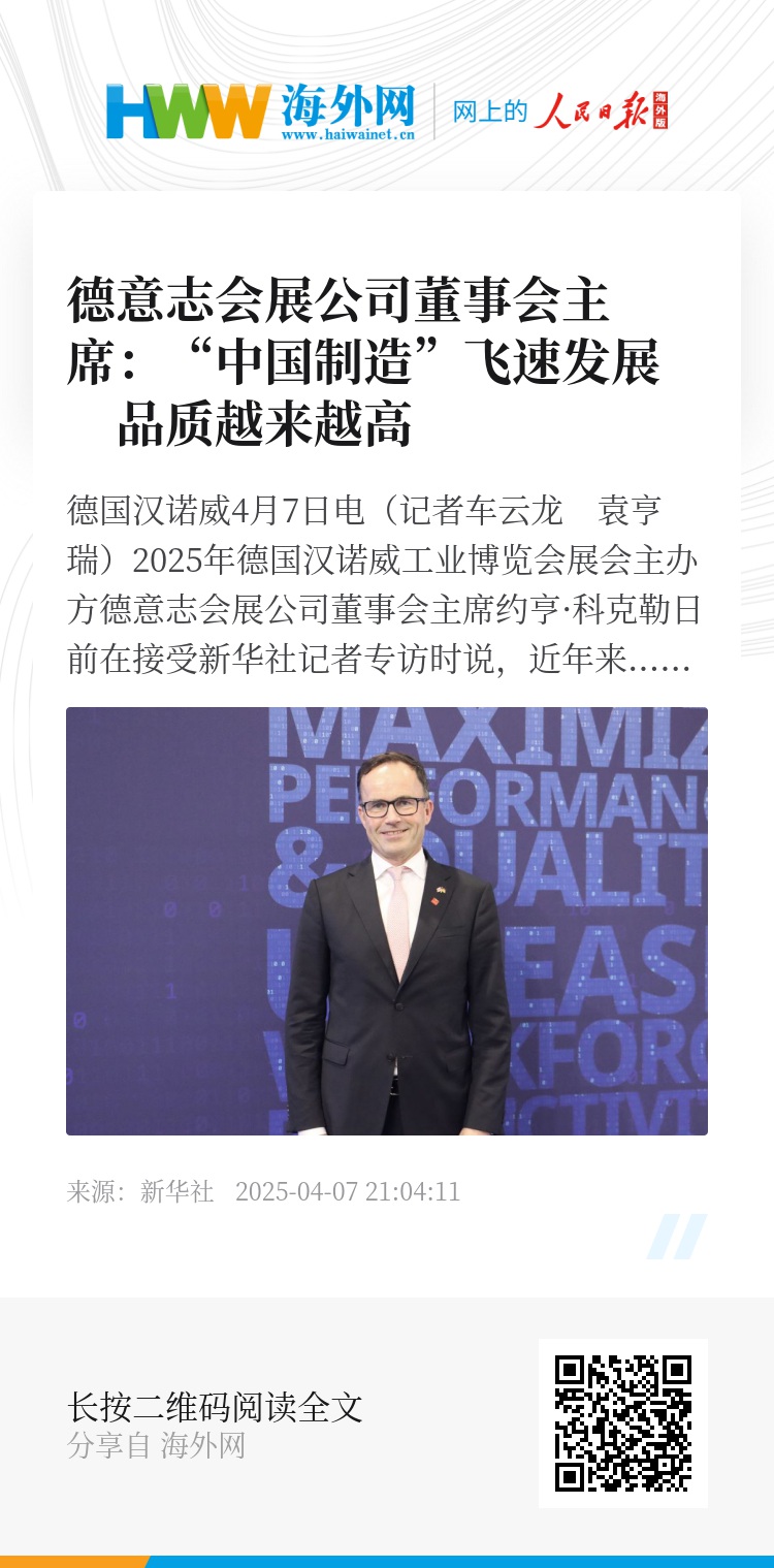 新华社德国汉诺威4月7日电(记者车云龙 袁亨瑞)2025年德国汉诺威工业博览会展会主办方德意志会展公司董事会主席约亨·科克勒日前在接受新华社记者专访时说,近年来,“中国制造”飞速发展,取得“巨大提升”,品质越来越高。通过汉诺威工博会这一平台,中国产品和解决方案赢得越来越多国际参展商认可。