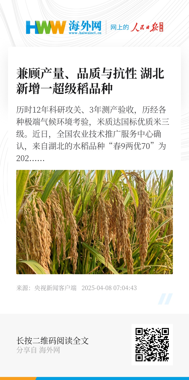 历时12年科研攻关、3年测产验收,历经各种极端气候环境考验,米质达国标优质米三级。近日,全国农业技术推广服务中心确认,来自湖北的水稻品种“春9两优70”为2025年度超级稻品种。