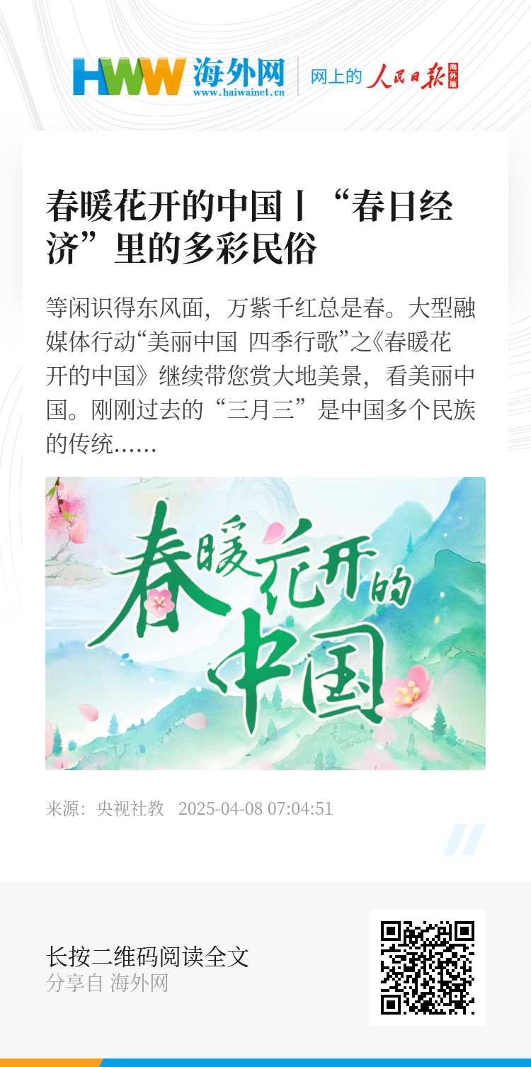 等闲识得东风面,万紫千红总是春。大型融媒体行动“美丽中国 四季行歌”之《春暖花开的中国》继续带您赏大地美景,看美丽中国。刚刚过去的“三月三”是中国多个民族的传统节日,壮族、苗族、瑶族等群众以歌会友、长桌共宴、竞技比拼,将这份独特的文化记忆世代传递。