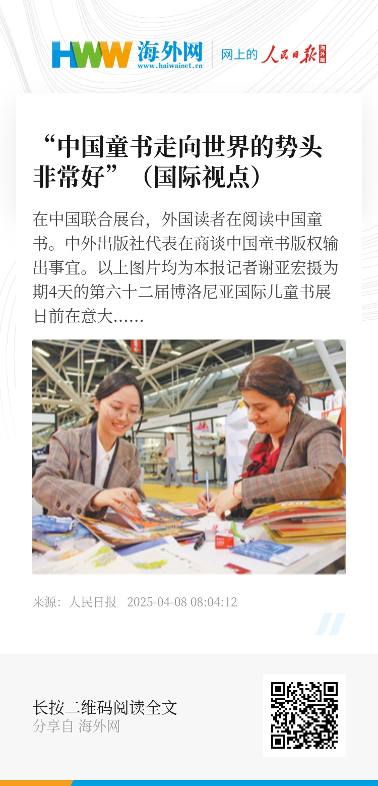 记者遇到了正在认真阅读《习近平讲故事(少年版)》的意大利世界中国出版社总编辑莱娅·文德拉梅尔。她表示:“这本书将习近平主席的讲话与生动通俗的故事结合起来,符合青少年的阅读习惯和兴趣。我认为,这本书可以帮助更多的外国青少年了解中国的文化历史和发展现状。”中国少年儿童新闻出版总社(以下简称“中少总社”)副总编辑蔺玉红介绍,《习近平讲故事(少年版)》由中少总社负责海外推广,目前已累计发行俄文、意大利文、西班牙文、日文等23个版本,成为中少总社版权输出的“拳头产品”。