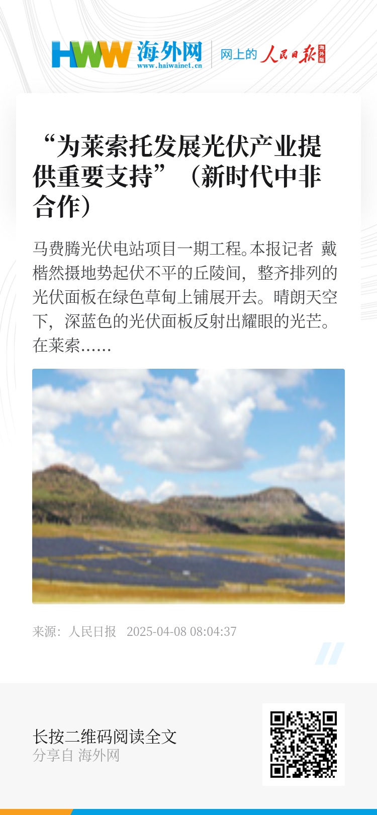 “感谢中国企业承建的光伏电站项目,马费腾迎来了发展的新篇章。”马费腾市市长莱罗托利·塞伊索表示,项目为当地民众提供了工作岗位,带动相关行业的发展,“中方将光伏电站的运营经验传授给当地工程师,帮助他们成为莱索托建设新能源项目的支柱人才。期待更多中国企业来到莱索托投资兴业,助力莱中务实合作取得更多成果。”(本报记者 戴楷然)