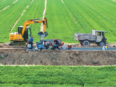 江苏省宿迁市泗洪县大楼街道周庄社区高标准农田改造提升现场,工人正修筑防渗渠。张连华摄(人民图片)