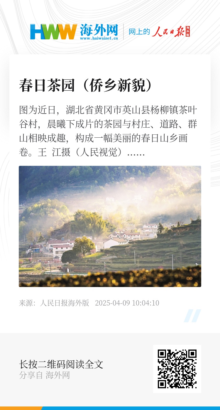 图为近日,湖北省黄冈市英山县杨柳镇茶叶谷村,晨曦下成片的茶园与村庄、道路、群山相映成趣,构成一幅美丽的春日山乡画卷。