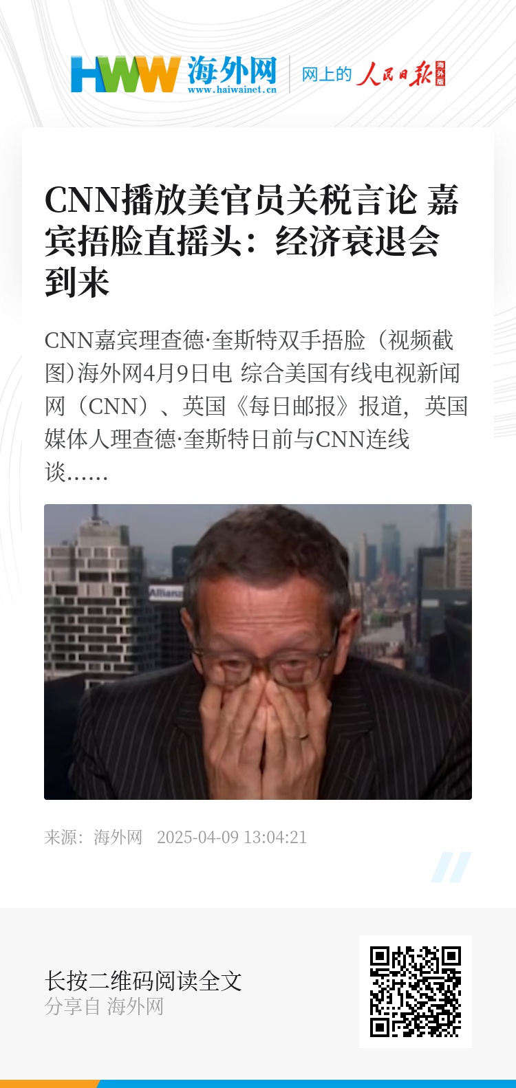 海外网4月9日电 综合美国有线电视新闻网(CNN)、英国《每日邮报》报道,英国媒体人理查德·奎斯特日前与CNN连线谈及美政府加征关税政策时,双手捂脸难掩激动情绪。