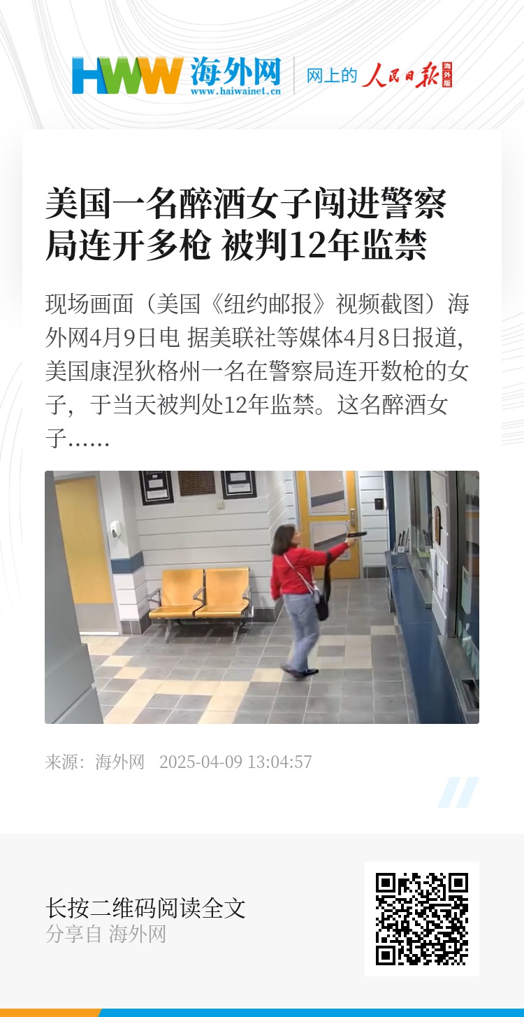 海外网4月9日电 据美联社等媒体4月8日报道,美国康涅狄格州一名在警察局连开数枪的女子,于当天被判处12年监禁。