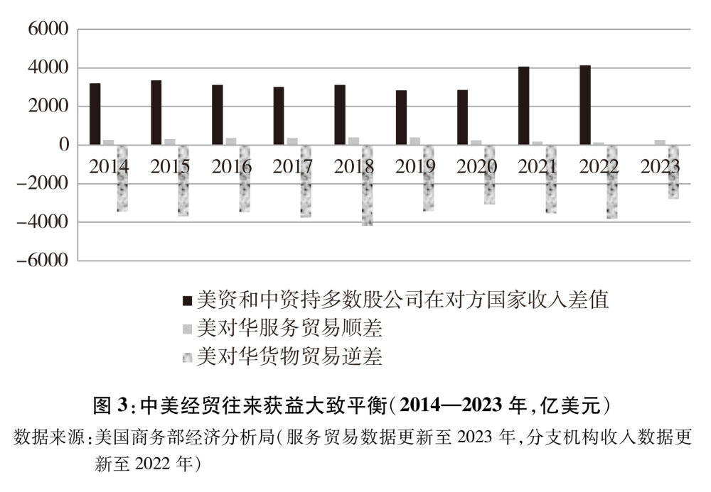 中美经贸往来获益大致平衡。客观认识和评价中美双边贸易是否平衡,需要全面深入考察,不能只看货物贸易差额。在经济全球化深入发展、国际化生产普遍存在的今天,双边经贸关系内涵早已超出货物贸易范围,服务贸易和本国企业在对方国家分支机构的本地销售额(即双向投资中的本地销售)也应纳入。综合考虑货物贸易、服务贸易和本国企业在对方国家分支机构的本地销售额三项因素,中美双方经贸往来获益大致平衡(图3)。