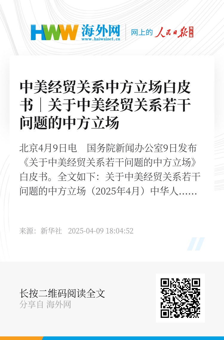 新华社北京4月9日电 国务院新闻办公室9日发布《关于中美经贸关系若干问题的中方立场》白皮书。全文如下: