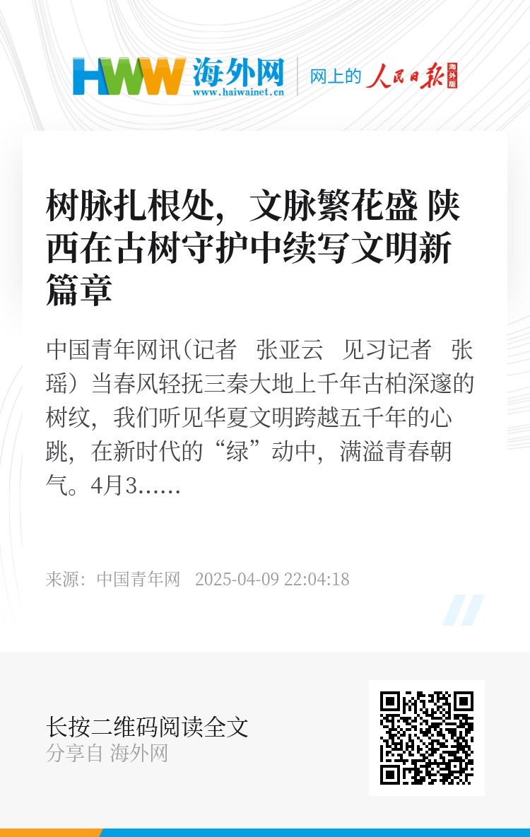 人不负古树,古树定不负人。从赤手空拳的守护到如今的科技赋能,守护者遥望巍巍秦岭、关中平原和陕北高原同频坚守传承,三秦儿女对古树的珍视,早已深深融入血脉。古树亦以其独特的方式反哺人类,它们扎根大地,涵养生态,凝聚起深厚的“根文化”,慰藉着每一颗既心怀乡土眷恋,又追逐时代梦想的心灵。人与树,在岁月的轮回里双向滋养、生命共荣。