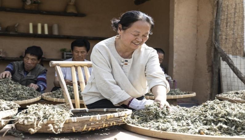 西安市鄠邑区蒋村街道柳泉口村,村民在加工艾草。摄影:王剑