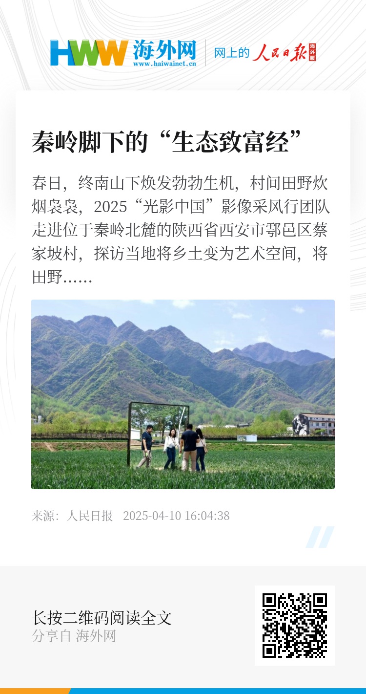 春日,终南山下焕发勃勃生机,村间田野炊烟袅袅,2025“光影中国”影像采风行团队走进位于秦岭北麓的陕西省西安市鄠邑区蔡家坡村,探访当地将乡土变为艺术空间,将田野化为展演现场,书写着“绿水青山就是金山银山”的生动实践。