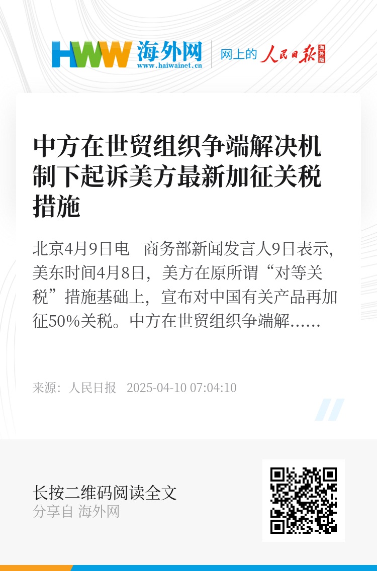 新华社北京4月9日电 商务部新闻发言人9日表示,美东时间4月8日,美方在原所谓“对等关税”措施基础上,宣布对中国有关产品再加征50%关税。中方在世贸组织争端解决机制下起诉美方最新加征关税措施。