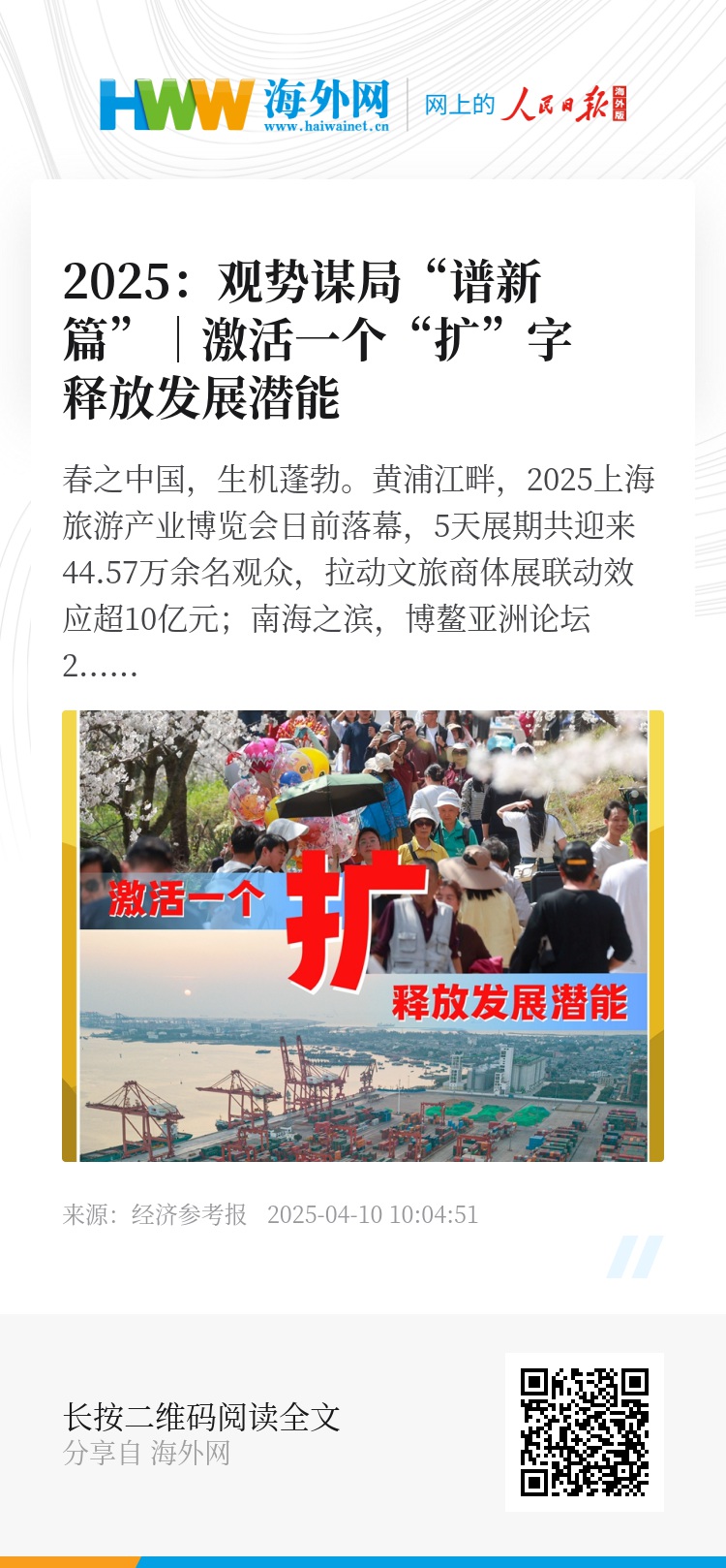 春之中国,生机蓬勃。黄浦江畔,2025上海旅游产业博览会日前落幕,5天展期共迎来44.57万余名观众,拉动文旅商体展联动效应超10亿元;南海之滨,博鳌亚洲论坛2025年年会余音犹在,让世界再次听到中国高水平开放的铿锵足音。